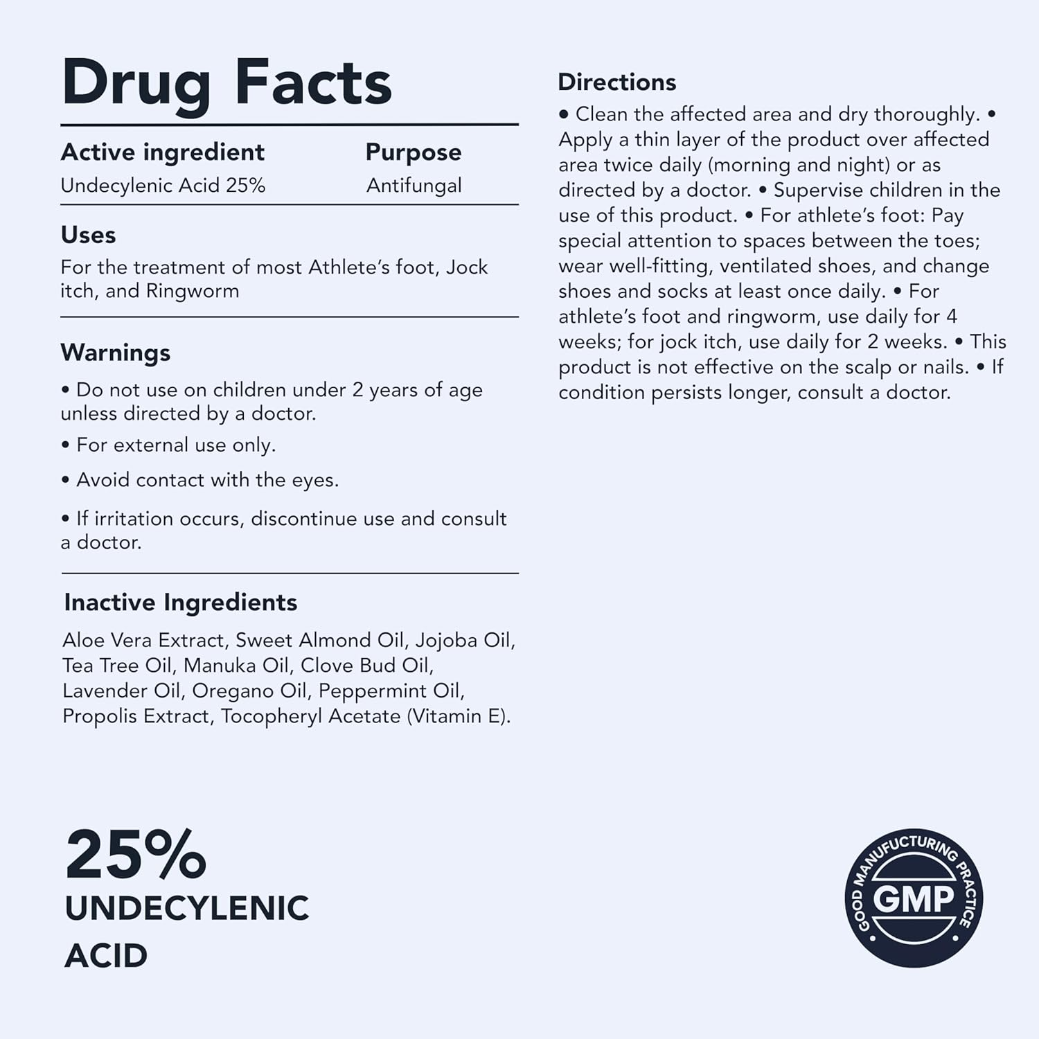 Undecylenic Acid (25%), Tea Tree Oil, Oregano Oil, Manuka Oil, Clove Bud Oil, Propolis Extract, Tocopheryl Acetate (Vitamin E), plus other supporting ingredients for optimal penetration.